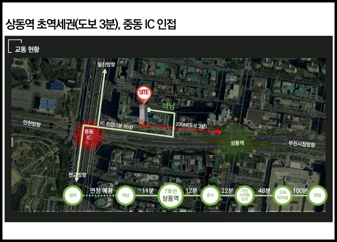 지하철7호선 상동역, 7호선 삼산체육관역∘부천시청역, GTX-B∘D 노선(예정), 7호선 청라 연장선(2027년 예정), 송내부천선(2025년 예정), 부천버스터미널, 길주로, 수변로, 송내대로, 중동IC, 송내IC, 서운JC, 경인고속도로, 인천국제공항고속도로, 영동고속도로, 수도권제1순환도로 등 서울, 수도권 어디든 쾌속이동 사통팔달 교통요충지입니다.