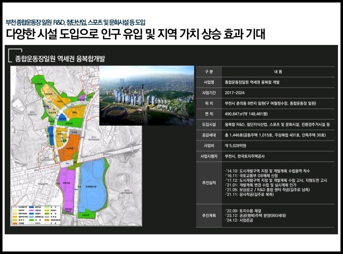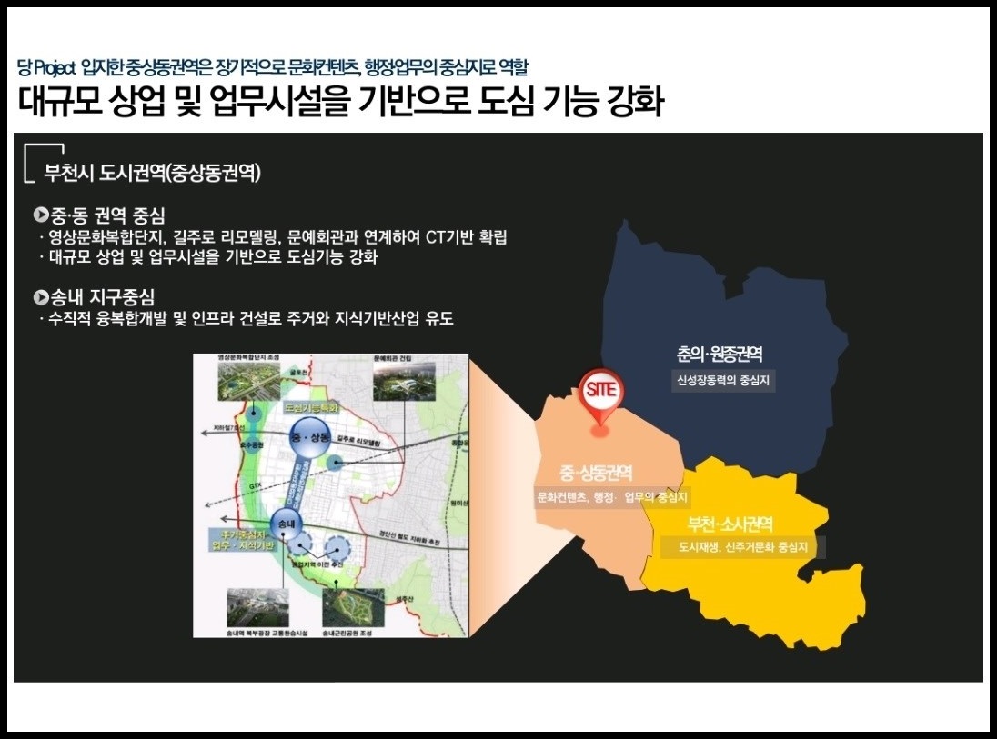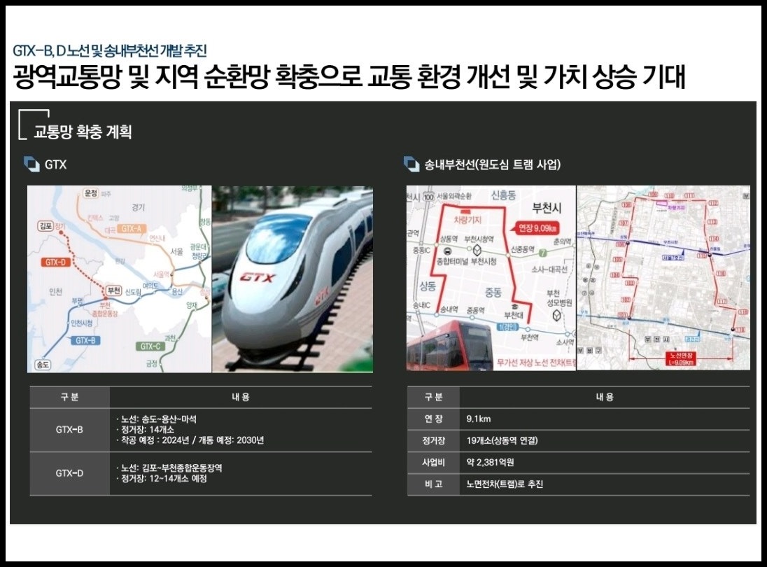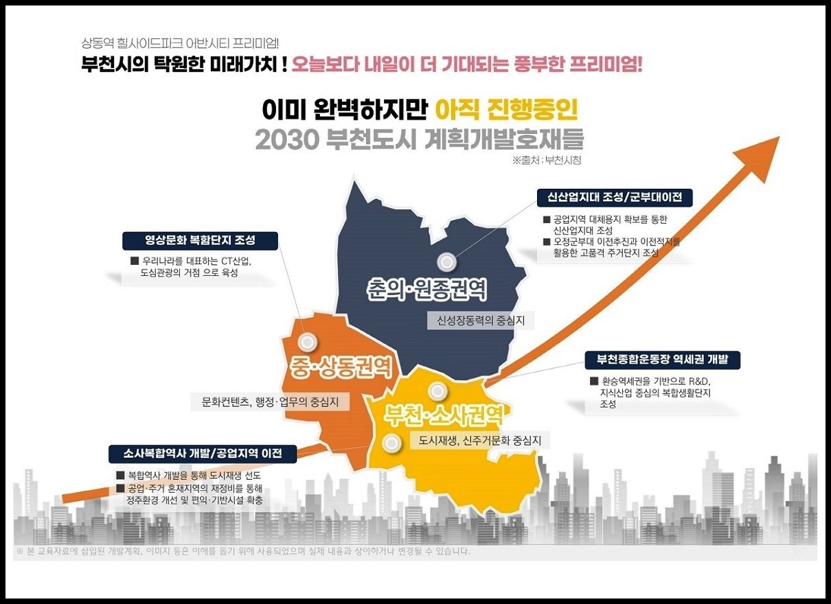 2030 부천도시개발계획, 소사복합역사 개발∘공압지역 이전, 신산업지대 조성∘오정군부대 이전, 부천종합운동장 역세권 개발, 대장지구∘계양지구 등 대규모 택지지구, 38만㎡(약 12만평) 규모 부천영상문화산업단지 조성 중(△6천여세대의 주거시설 △소니픽처스 등 국내외 28개사가 입주하는 뉴콘텐츠 생산 융∘복합센터 △870개사 영상 콘텐츠 기업 △e-스포츠 경기장 △70층 규모 랜드마크 타워 △300실 규모 호텔 등 예정), 343만㎡ 규모 신도시 조성 사업인 대장신도시 개발사업이 진행 중(약 4만8천여 명 인구 유입 전망➜인프라 구축∘경제 활성화 등 지역가치 상승 기대) 등 개발 호재가 많습니다.