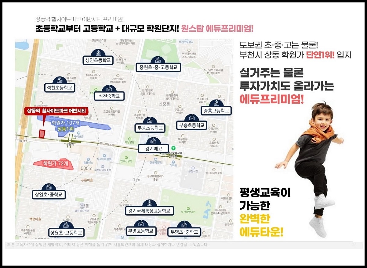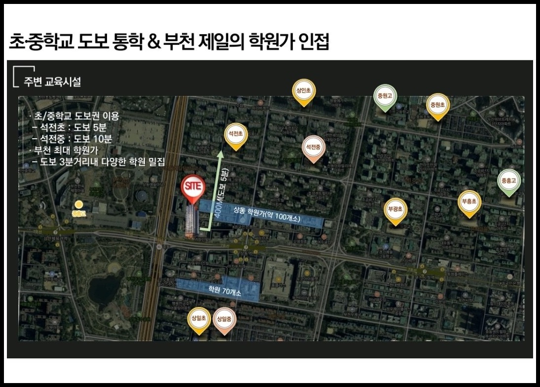 석천초, 부광초, 부흥초, 상인초, 중원초, 석천중, 상일초, 상일중, 중원중, 구산중, 상원고, 경기예술고, 부천정보산업고, 부개여자고, 부광여자고, 경기국제통상고, 부명고, 부천대 등 명문학군과 부천 제일의 학원가가 가까이에 위치합니다.