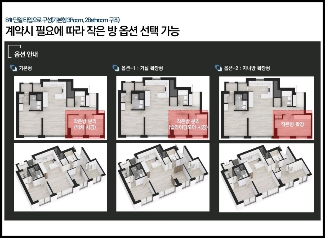 아울러, 탁월한 개방감 높은 층고, 드레스룸, 팬트리 등 공간 활용 극대화, 친환경 고급 마감재, 풍요로움과 아름다움을 공간에 담은 품격 있는 인테리어 등 트렌디한 특화설계를 하였으며 계약 시 필요에 따라 작은 방 옵션 선택이 가능합니다.