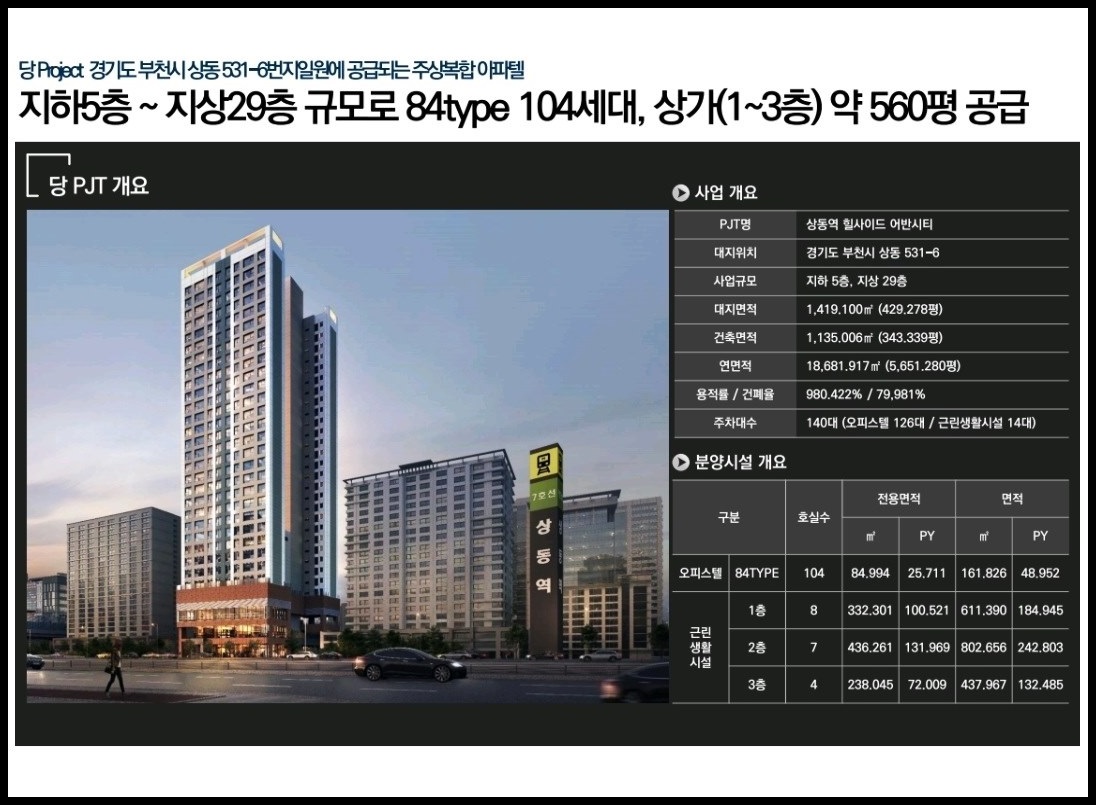 상동역 힐사이드 어반시티 PJT명으로 경기도 부천시 상동 531-6번지 일반상업지역, 지구단위계획구역에 지하5층~지상29층 1개 동 규모로 조성(예정)되며 오피스텔 104세대, 지상1~3층 근린생활시설 전용 약 560평(19개 호실)으로 구성(예정)됩니다.