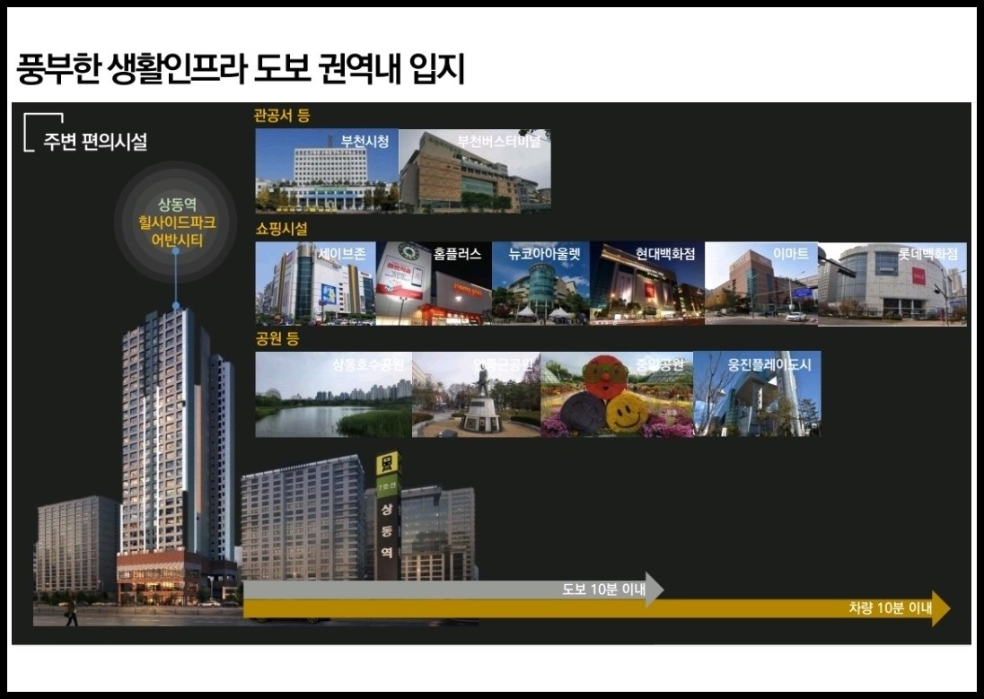 홈플러스익스프레스 부천상동2∘3점, 뉴코아아울렛 부천점, 이마트 중동점, 현대백화점유플렉스 중동점, 현대백화점 중동점, 롯데백화점 중동점, 롯데하이마트 부천중동점, 롯데마트 삼산점, 2001아울렛 부평점, 부평농협하나로마트, 삼산농산물도매시장, 웅진플레이도시, 부천아트센터, 롯데시네마 부평갈산, 부천시청, 상3동 행정복지센터, 신상119안전센터, 순천향대 부천병원, 가톨릭대 부천성모병원, 가톨릭 인천성모병원, 부천종합운동장, 부천체육관 등 다 갖춰진 다양한 생활 인프라를 편리하게 누리실 수 있습니다.