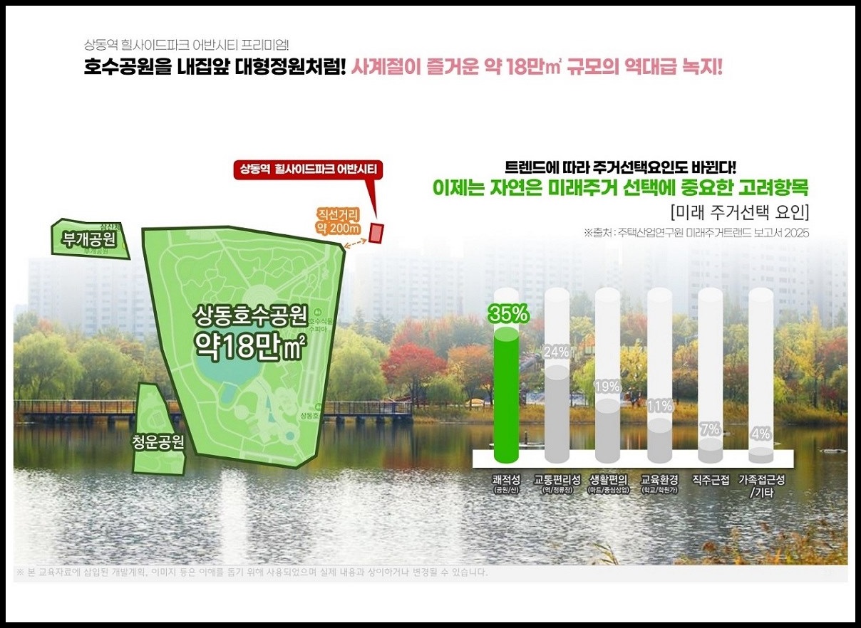 상동호수공원(18만㎡) 수변 경관, 부천중앙공원(12만㎡), 삼산체육공원, 시냇물공원, 삼산건강공원, 삼산교통공원, 진달래공원, 계남공원, 안중근공원, 춘의산, 원미산, 굴포천 등 쾌적하고 청정한 자연환경 속에서 365일 삶의 여유가 더 커지는 힐링 라이프가 가능합니다.