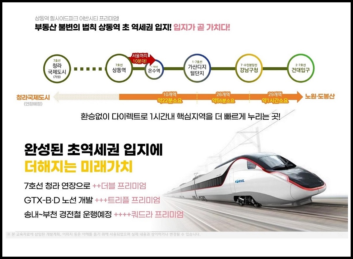 부천 상동 최중심, 황금노선 7호선 상동역 바로 앞, 부천의 중심에서 강남처럼 누리고 강남보다 빛나는 프리미엄까지 누리며 부천의 주거 지도를 새롭게 써 내려가는 상동역 힐사이드 어반시티를 분양합니다.